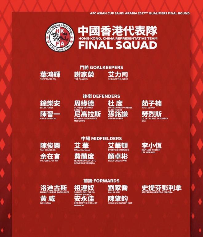 中国的香港足球队将于10月会见两个亚洲杯的预选赛,并将对阵孟加拉国。韦斯特伍德教练宣布了25名球员的最终名单。与上个月底发布的主要名单34相比,一些球员已从选举中淘汰。在守门员的位置方面,吴恩斯南部的Wu Waian没有被选中,并由乌克兰的守门员埃利斯(Ellis)取代,后者自上个赛季以来几乎没有机会参加比赛。此外,总共六名在非洲大陆或国外比赛的球员,包括上海超级联赛港口的Aleks,中国超级联盟的金迪多海牛等,最终名单丢失了。至于选定的球员,周Yuande,Ru Zinan,Chen Jinyi和Sun Mingqian毫无问题地注册。搬到东部分区的中央后卫和Zon Lean也继续写道。在最前沿,像Eyongjia,Lodygus,Liu Jiaqi这样的球员AO等。他们有能力扮演核心角色,而Aihua,Zuliannu,Aihuaton和Li Xiaoheng等球员则具有更高速度的优势。香港中国队将在10月6日晚上离开,将于10月9日挑战孟加拉国,然后第二天返回香港,并于10月14日在他位于Kai Tak Sports Park的家中面对同一对手。这是中国香港球队25名球员的最后清单:守门员:Ye Honghui(东方),Xie Jiarong(da Po),Ellis(No Team)捍卫者:Zhou Yuande(Henan Jiuzu Du Kang),Du Du(Li wen),Ru wen),Ru jinan(li wen)老虎,法律(扬比恩·朗丁),中场的中场者:chiang junlu(jijiazhuang kung Zhan han Zhan Zhan po):Zu Liannu(Jie Zhi)(Jie Zhi) Jiaqiao(Li Wen),Li Xiaoheng(Taishan,Shandong),Eyongjia(深圳市Xinpengeng),Lodigus